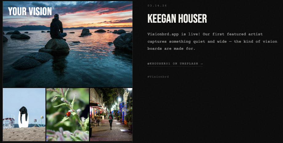 New! Make moodboards. Own them completely. No accounts. No cloud. No algorithm deciding what your creativity is worth. Just a clean grid, your images, and an export button. “It’s like Pinterest except you own your own vision boards. visionbrd is a free, browser-based image layout tool built for people who are done feeding the machine. Choose a layout, drop in your images, add a title, export. Your board lives on your device — not in a database, not behind a login, not subject to a platform’s terms of service revision next Tuesday. We are billionaire-proofing the web one app at a time. visionbrd is part of that project. Built by Intertheory. Hosted on the open web. Always free to use. Proud of your board? Submit for featured gallery. Coming soon: Blarp Studio Jubilation Printmkr and other fun surprises