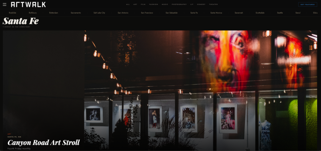 This app is the latest iteration of a virtual art crawl that began on twitter.com in 2009. ArtwalkTV.app is now a global directory of art walks, film festivals, fashion weeks, music festivals, literary, comedy, photography, theater, and dance events — updated by the community. Free to use, with no accounts, no ads, and no algorithms deciding what you see. Now taking submissions for Featured Artists, Donors, and Featured Events. Click that Get Featured button to submit your website for possible inclusion. Built by Intertheory. Hosted on the open web. Always free to use.